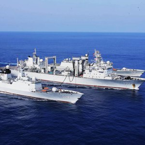 中国海军第23批护航编队舰艇进行航行补给(2016年4月25日摄)。新华社发(钱宏摄)
