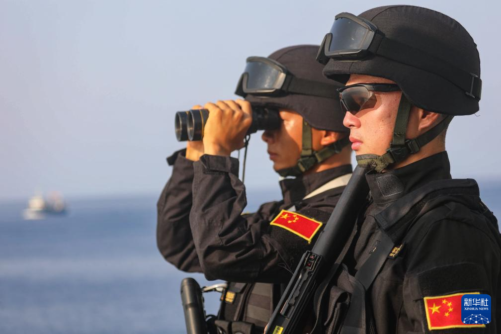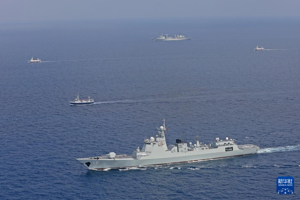 中国海军第45批护航编队乌鲁木齐舰、东平湖舰为中国渔船护航(2023年10月20日摄)。新华社发(王远方摄)