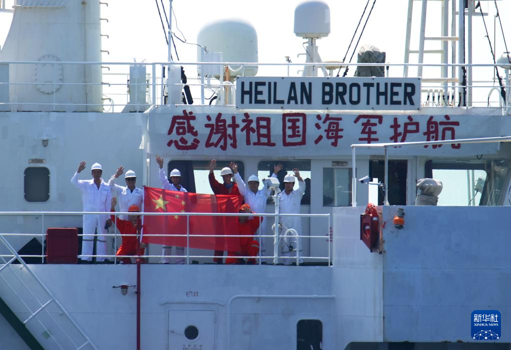 被护船舶悬挂起“感谢祖国海军护航”的横幅,向中国海军第42批护航编队挥手致意(2022年11月5日摄)。新华社发(马玉彬摄)