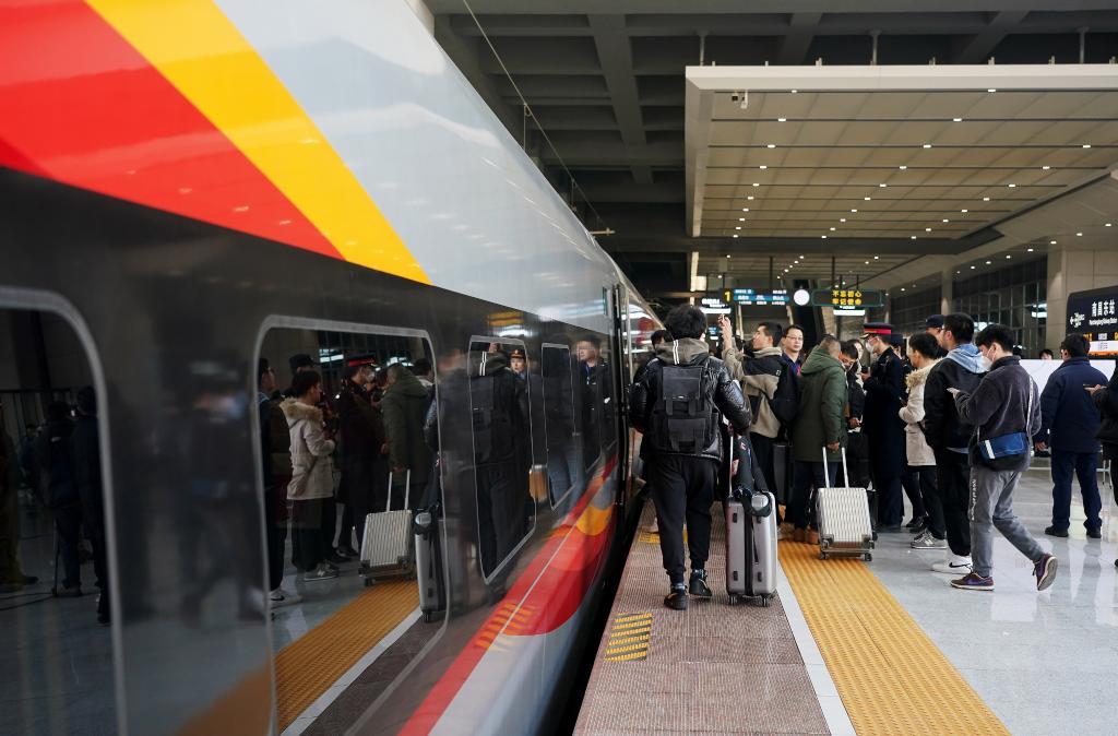 昌景黄高铁首批旅客在南昌东站乘坐列车。新华社记者 万象 摄