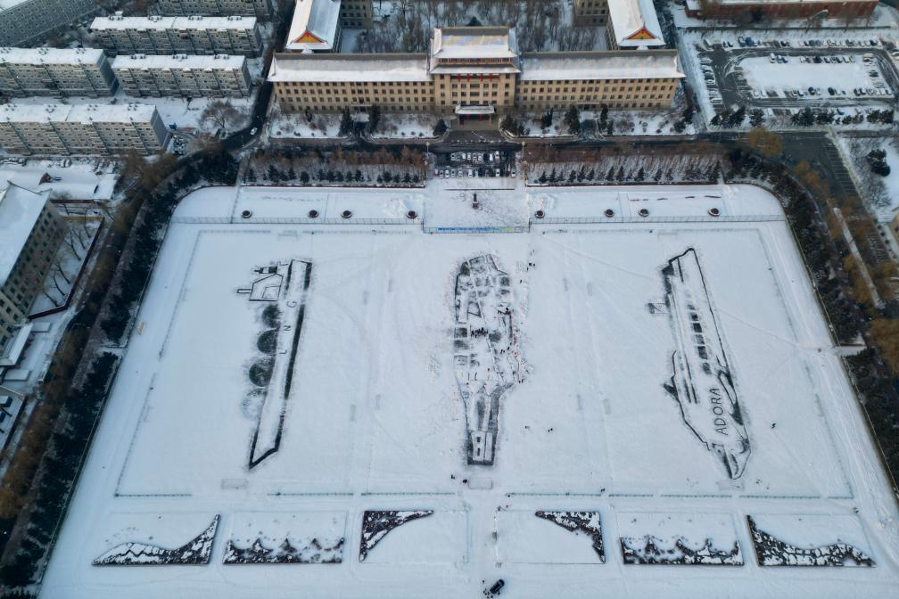 在我国最北省会城市哈尔滨,哈尔滨工程大学近千名师生在元旦前一天历时5个小时,在学校操场上用皑皑白雪打造出“福建舰”航空母舰、“爱达·魔都号”邮轮、“大鹏昊”运输船。