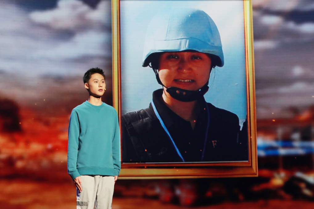 大屏上,一个孩子正在读妈妈写给他的信:“明天早上8点,我们就要离开祖国,唯一放心不下的是我的心肝宝贝云云。云云,我的宝贝儿子,记住了,你的妈妈是一名联合国维和警察……如果有人问你,你的妈妈是做什么的?你可以很自豪地告诉他,我妈妈是维和警察,表现一定优异。”