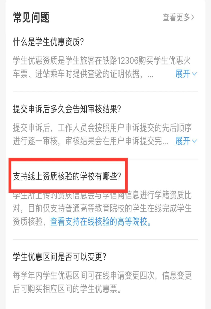 打开铁路12306App,右下角进入“我的”页面,在学生资质填写页面的“常见问题”中,找到“支持线上资质核验的学校有哪些?”即可查看支持在线核验的学校名单。