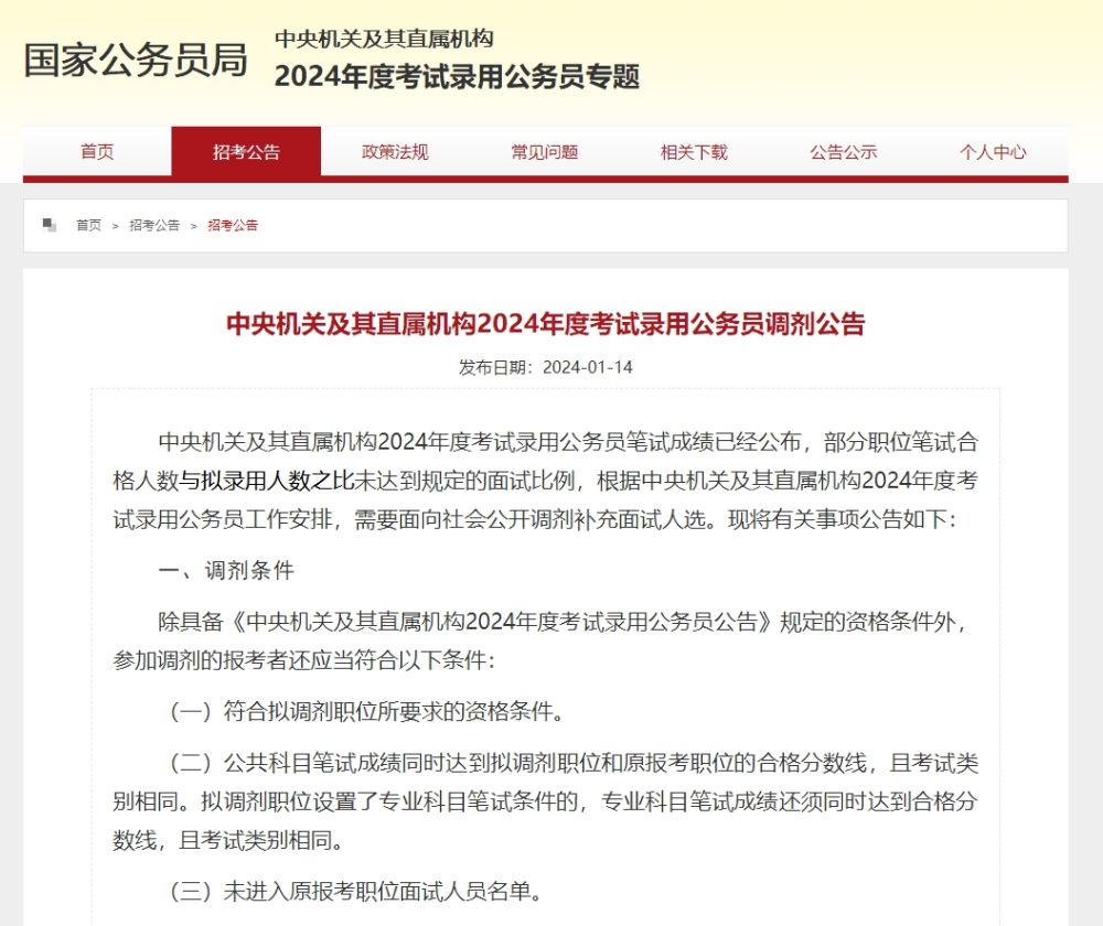 中央机关及其直属机构2024年度考试录用公务员笔试成绩已经公布,部分职位笔试合格人数与拟录用人数之比未达到规定的面试比例,根据中央机关及其直属机构2024年度考试录用公务员工作安排,需要面向社会公开调剂补充面试人选。现将有关事项公告如下: