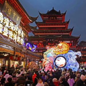 2024年1月21日,游客在豫园商城中心广场赏灯拍照。当日,2024上海豫园民俗艺术灯会正式亮灯。今年豫园灯会续写“山海奇豫记”,以“海经篇”为主题,生肖龙灯、海底世界、鱼群起舞、奇幻仙境等场景让游客在灯火绚烂的国风幻境中喜迎龙年新春。新华社记者 刘颖 摄