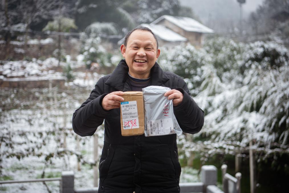 2023年2月22日,湖北省宣恩县村民吴昌云展示在锣圈岩村邮站取到的快递。新华社记者 伍志尊 摄