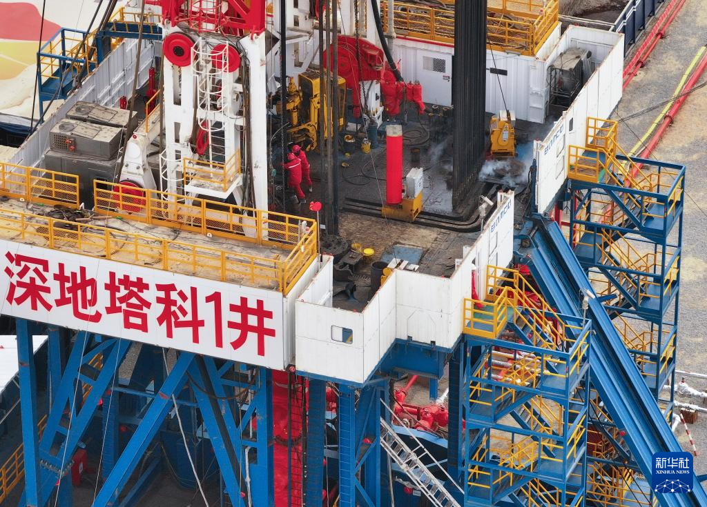 2月2日,在深地塔科1井,工作人员在协同机械进行钻井作业(无人机照片)。新华社记者 李响 摄