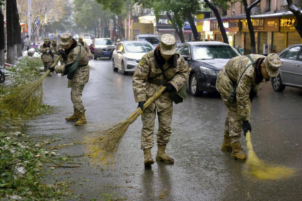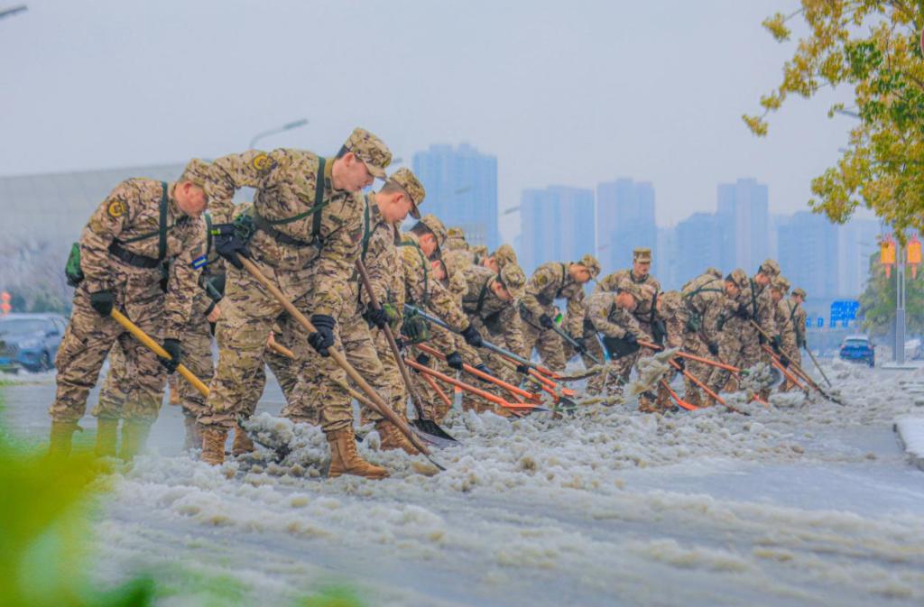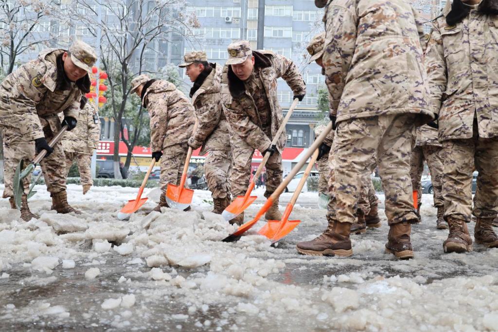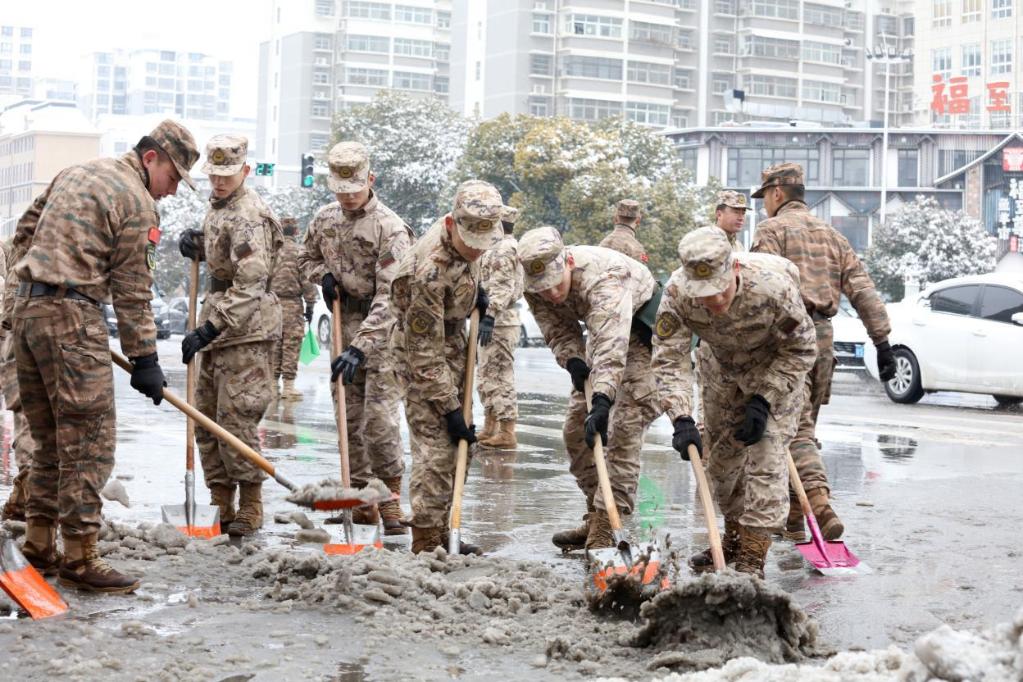 武警湖南总队岳阳支队派出三批官兵参与铲冰除雪任务,协助恢复主城区道路交通。同时,任务官兵自发组成党员先锋队,持续奋战在关键路段和交通节点。