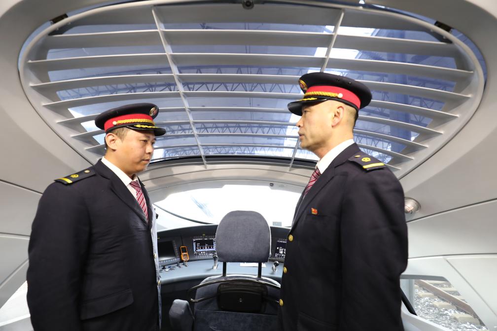 2月4日,在沈阳北站,交班司机和接班司机在司机室交接动车组运行状态和行车备品。新华社记者 杨青 摄