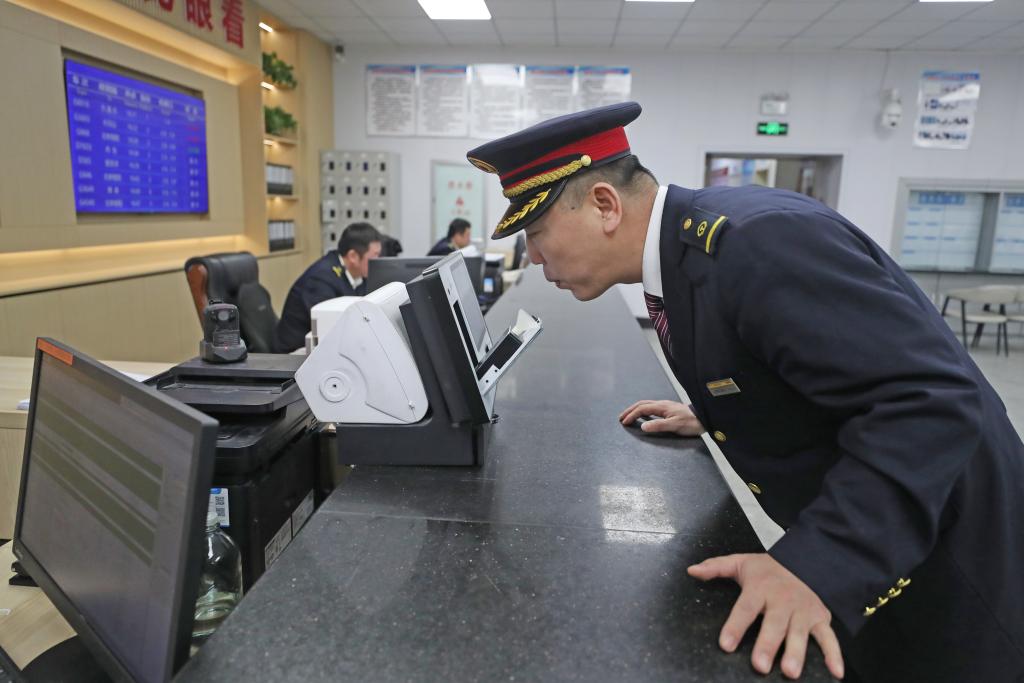 2月4日,在沈阳机务段动车运用车间派班室,动车司机在出发前检测酒驾。 新华社记者 杨青 摄