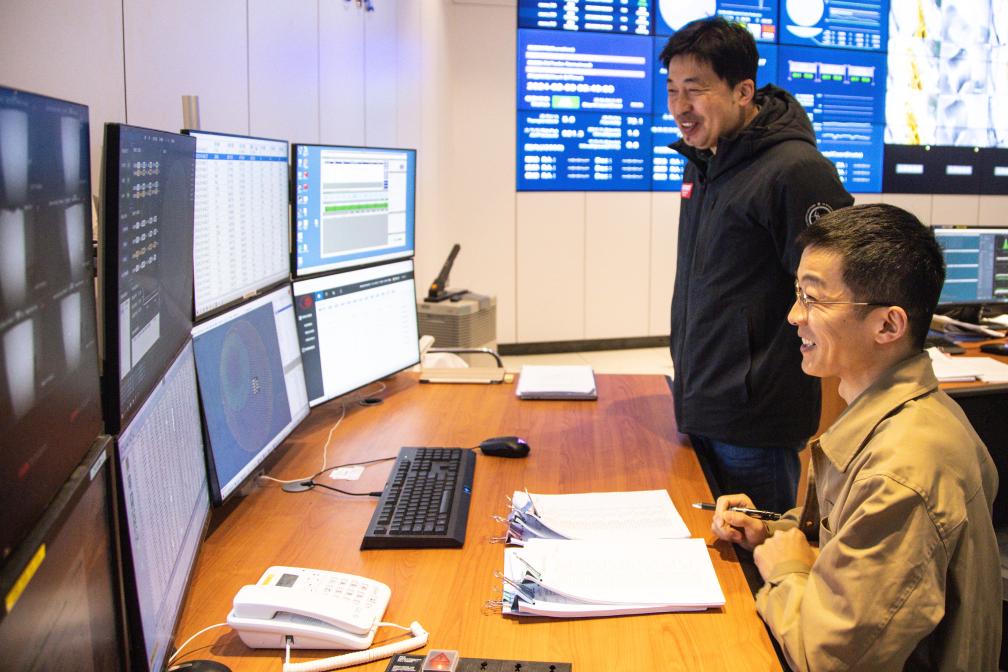 2月9日,姜鹏(后)与同事在“中国天眼”总控室内工作。(FAST运行和发展中心供图)