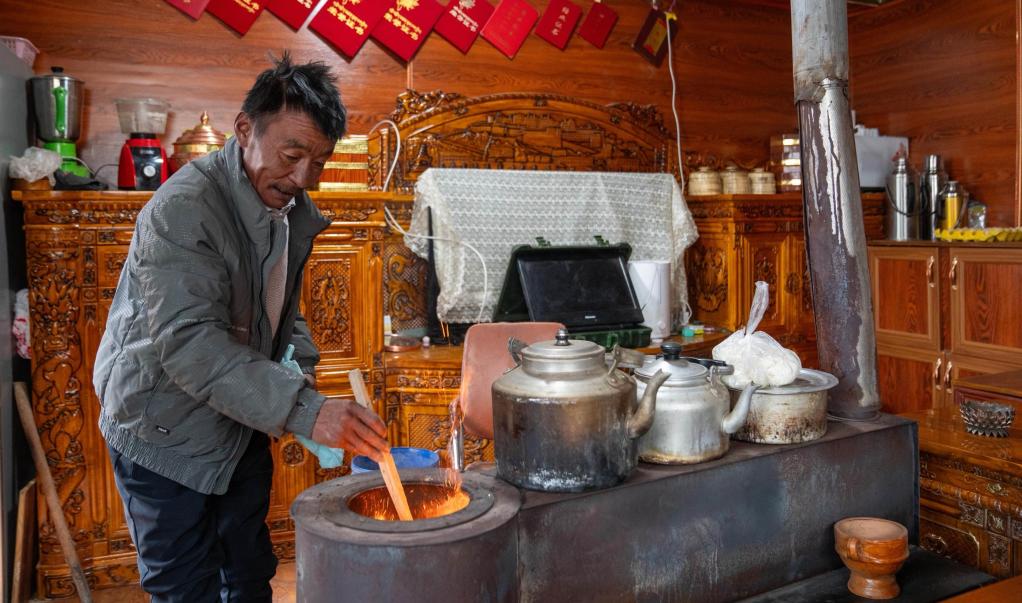 顿珠次旺在家里烧炉子取暖。新华社记者 旦增尼玛曲珠 摄