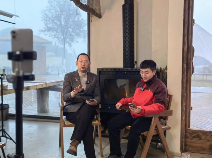 翁杰(左)和刘绍军正在直播,为村民介绍民宿用工需求。(受访者供图)