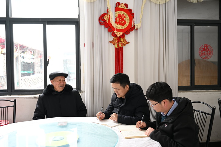 2024年2月2日,在小岗村“金昌食府”农家乐,记者姜刚(中)、水金辰(右)在采访大包干“带头人”严金昌。