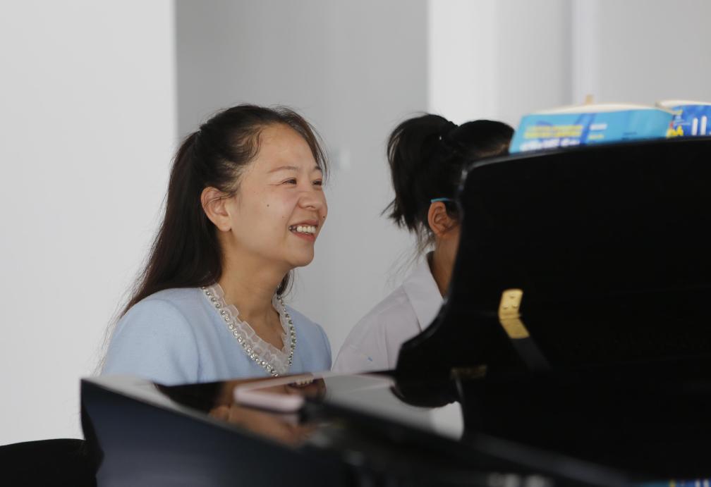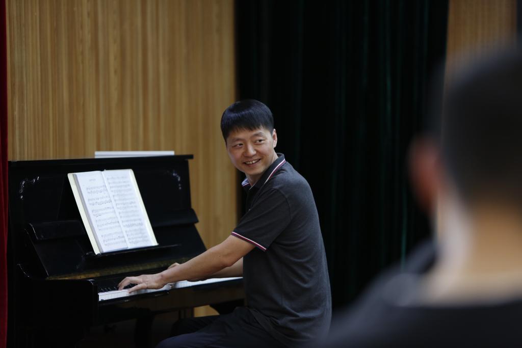 2023年5月24日,忽晓在许昌市群众艺术馆指导盲童合唱团的团员弹钢琴。