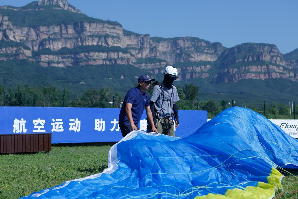 2023年6月8日,在河南林州市林虑山国际滑翔基地,马垒做飞行前的准备工作。