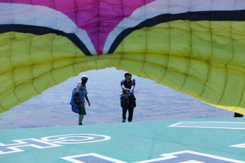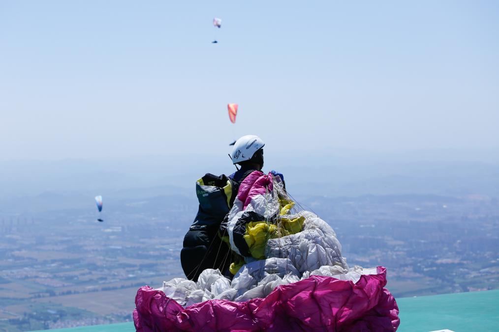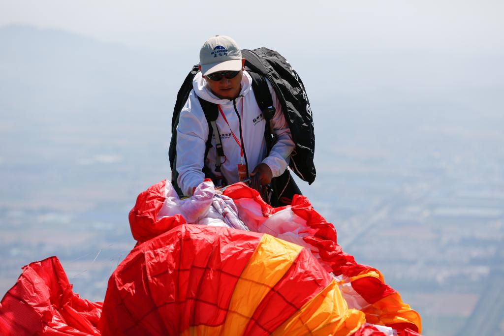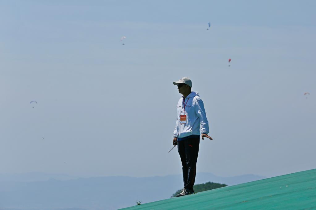 2023年6月15日,马垒帮助参赛者调整滑翔设备。
