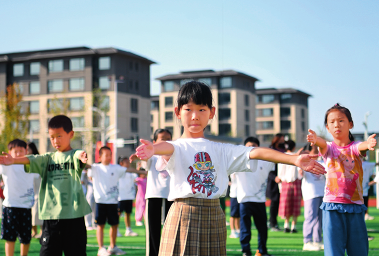 雄安史家胡同小学学生在操场上做体操(2023年9月13日摄) 朱旭东摄/本刊