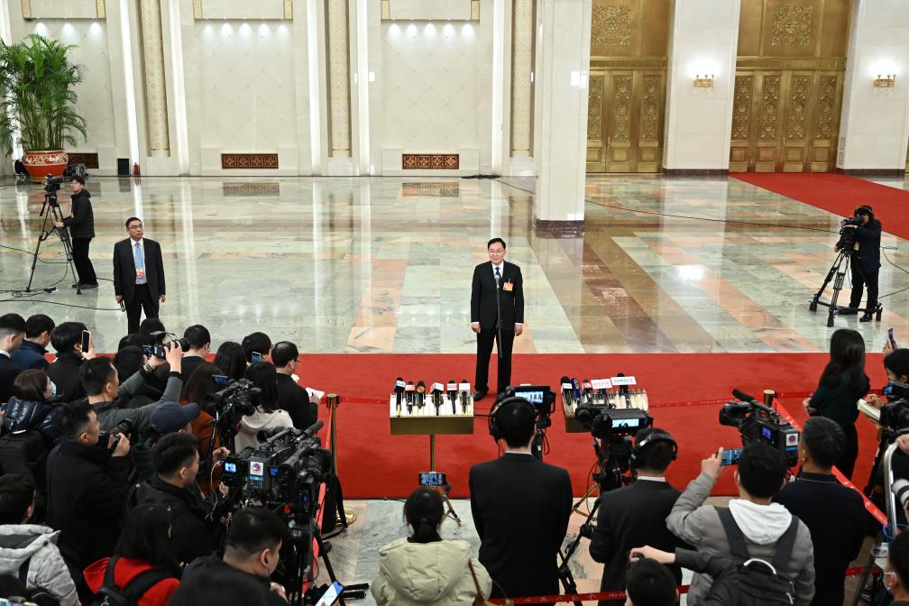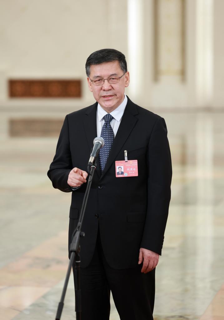 3月5日,第十四届全国人民代表大会第二次会议首场“部长通道”集中采访活动在北京人民大会堂举行。这是科学技术部部长阴和俊接受媒体采访。