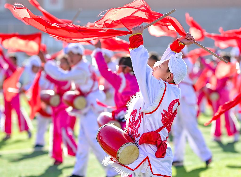 2023年11月16日,内蒙古鄂尔多斯市鄂托克前旗第二小学的学生在大课间表演安塞腰鼓。 新华社发(王正摄)