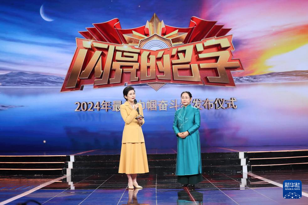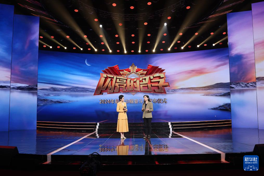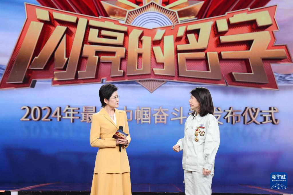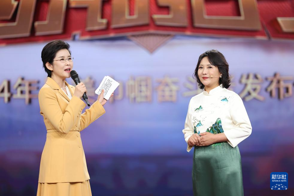 在2024年最美巾帼奋斗者发布仪式上,陕西省西安易俗社有限公司党支部书记、总经理惠敏莉(右)与主持人互动交流(3月4日摄)。新华社发pagebreakpagebreak