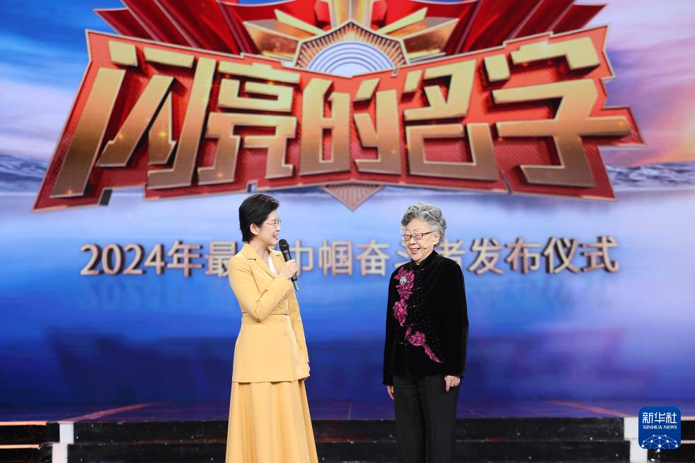 在2024年最美巾帼奋斗者发布仪式上,北京师范大学资深教授、中国文化国际传播研究院院长黄会林(右)与主持人互动交流(3月4日摄)。新华社发