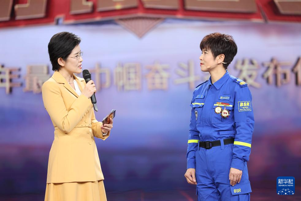 在2024年最美巾帼奋斗者发布仪式上,安徽省合肥市蓝天救援队队长苏琴(右)与主持人互动交流(3月4日摄)。新华社发pagebreakpagebreak