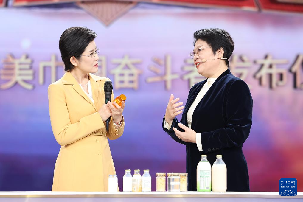 在2024年最美巾帼奋斗者发布仪式上,广州医药集团有限公司副总经理兼总工程师刘菊妍(右)与主持人互动交流(3月4日摄)。新华社发pagebreakpagebreak