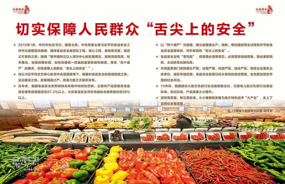 ◇以“四个最严”为遵循,建立起覆盖生产、销售、餐饮服务等全过程各环节的食品安全监管体系,守护老百姓“舌尖上的安全”。