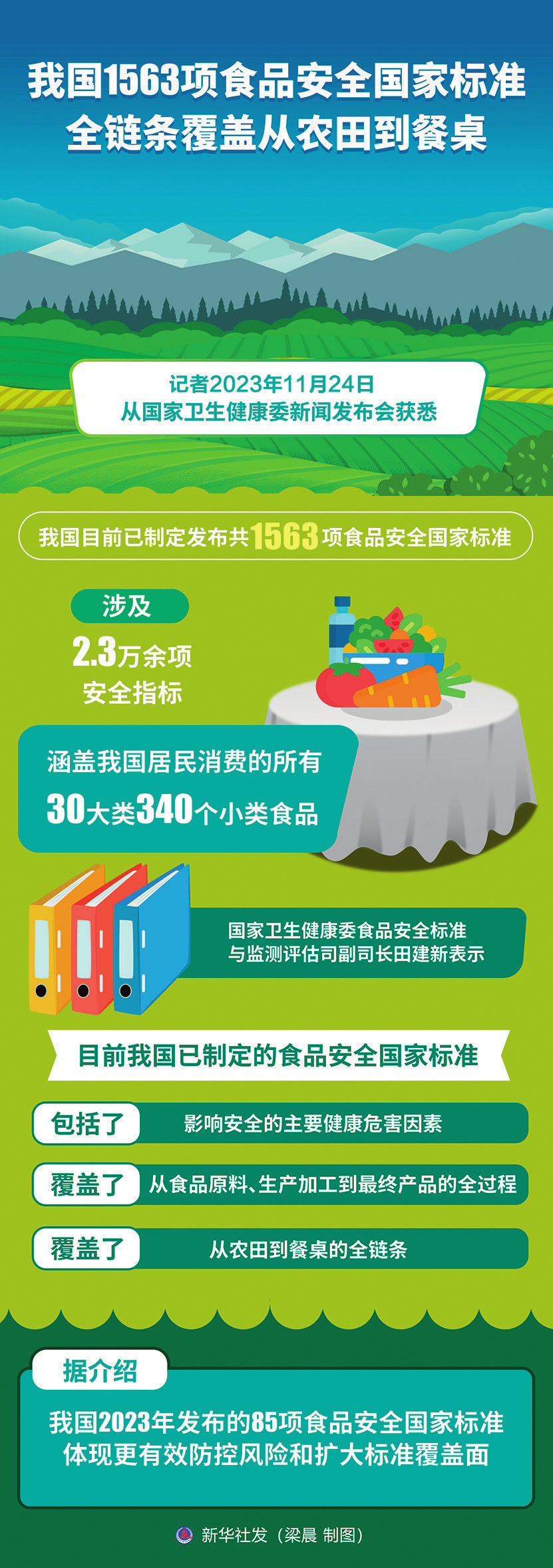 2023年2月,中共中央、国务院印发《质量强国建设纲要》,提出深入实施食品安全战略,推进食品安全放心工程。调整优化食品产业布局,完善食品安全标准体系,推动食品生产企业建立实施危害分析和关键控制点体系,加强生产经营过程质量安全控制。加快构建全程覆盖、运行高效的农产品食品安全监管体系,提升农产品食品全链条质量安全水平。
