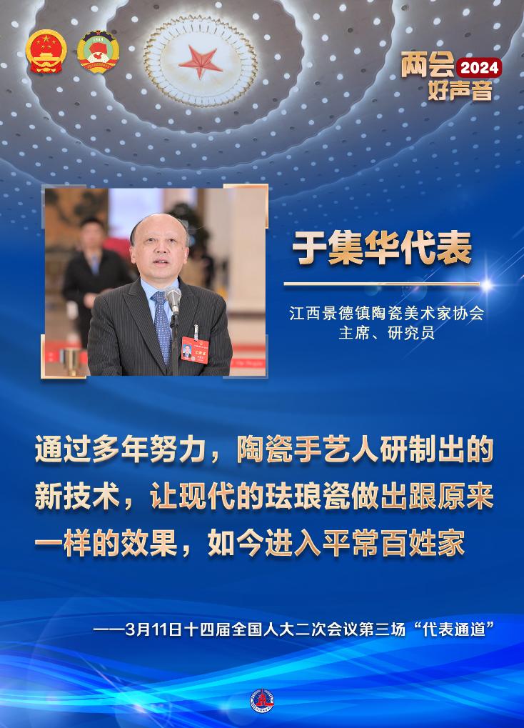 江西景德镇陶瓷美术家协会主席、研究员于集华代表说,通过多年努力,陶瓷手艺人研制出的新技术,让现代的珐琅瓷做出跟原来一样的效果,如今进入平常百姓家。