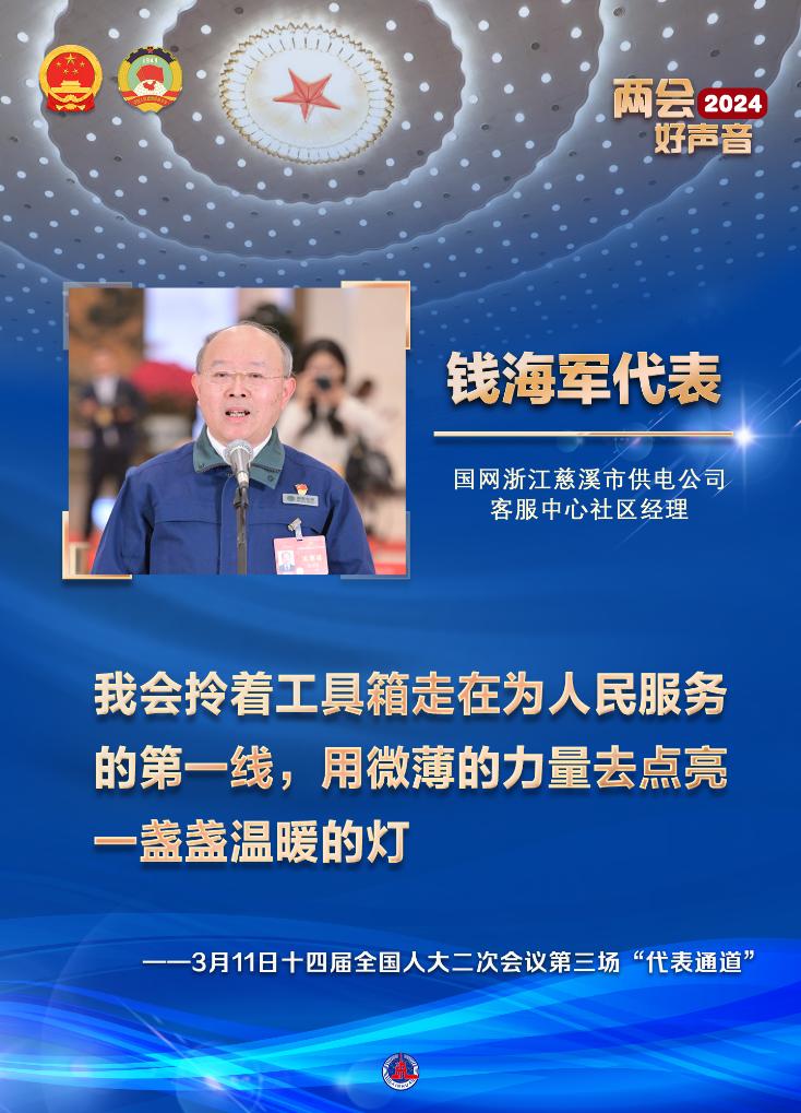 “看到亮堂堂的家,看到他们满足的笑脸,我们非常开心。”钱海军说,“我会拎着工具箱走在为人民服务的第一线,用微薄的力量去点亮一盏盏温暖的灯。”