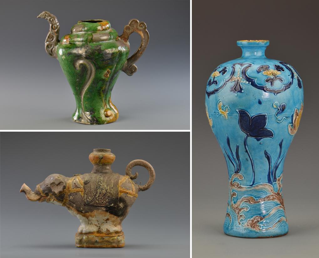 南海西北陆坡一号沉船遗址出水的瓷器(拼版照片):左上为螺形壶,左下为三彩象形持壶;右为珐华彩莲纹梅瓶。新华社发(全国十大考古新发现活动办公室供图)