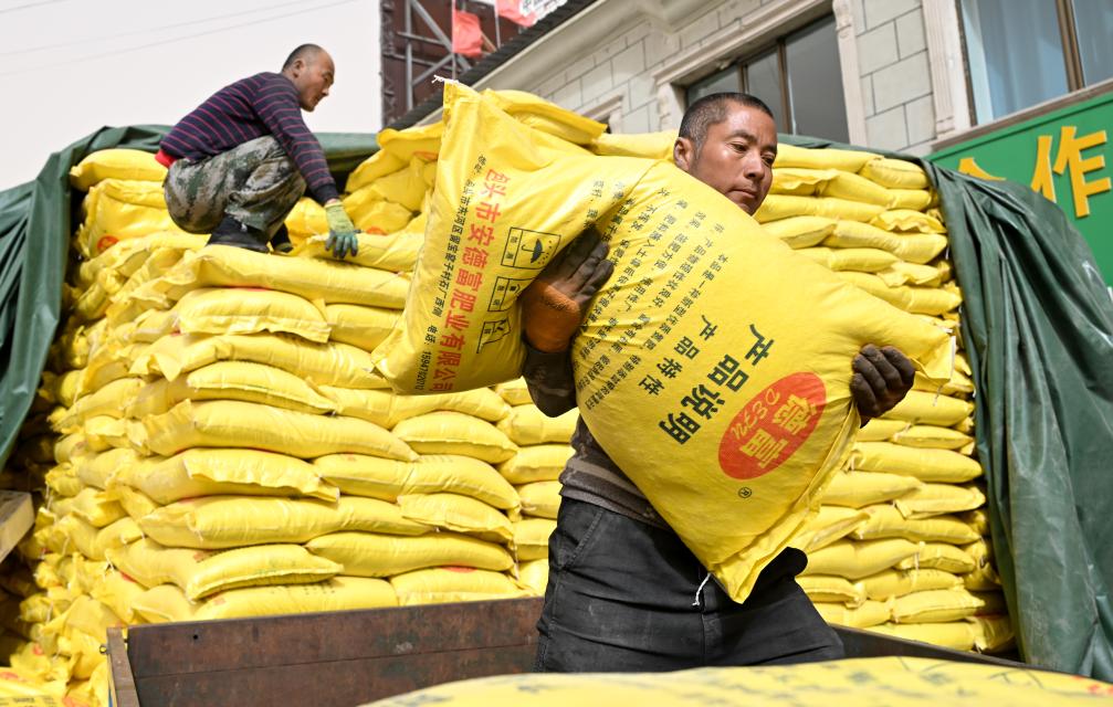 3月27日,工人在内蒙古呼和浩特市土默特左旗敕勒川镇只几梁村年年有余农业发展有限公司搬运化肥。新华社记者 贝赫 摄