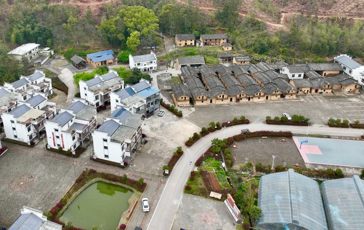 一边是66套白墙黛瓦的客家新楼,另一边是7栋土坯老屋。