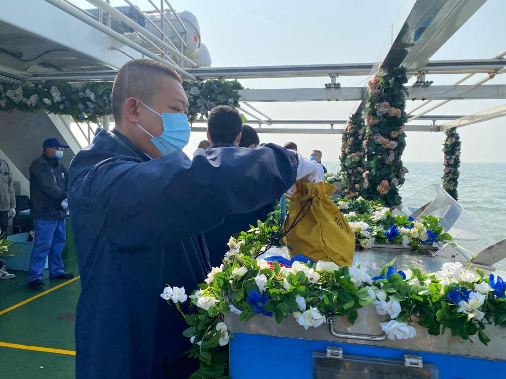 2024年清明节前夕,工作人员正在进行海葬准备工作。 新华社记者尹思源 摄