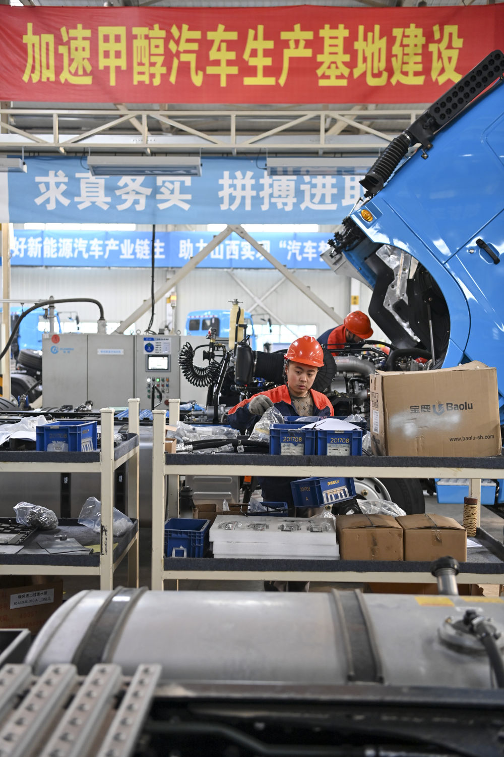 工作人员在位于山西省晋中市榆次区的山西新能源汽车工业有限公司(吉利晋中基地)生产甲醇重卡(4月1日摄)。新华社记者 杨晨光 摄