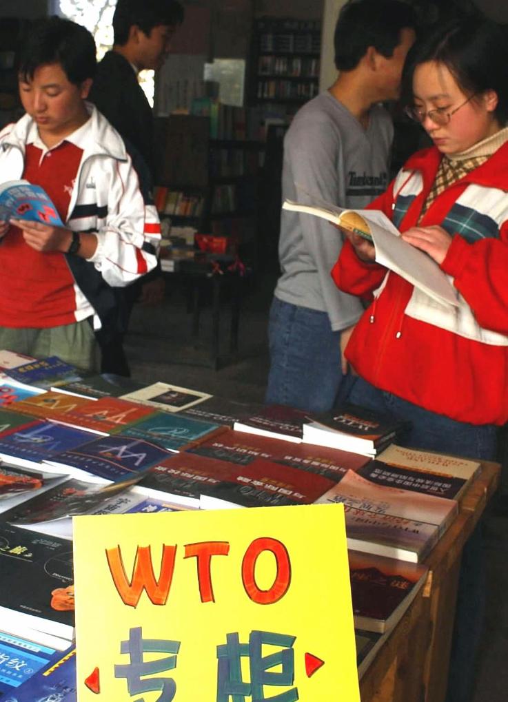 2001年,有关WTO的书籍、讲座在贵州成为热点,图为几名大学生在贵阳市西西弗书店的WTO专柜前选购图书。