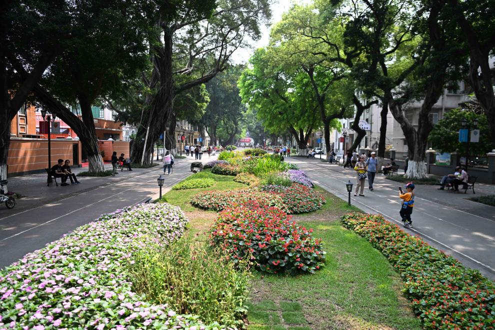 广州沙面大街上绿树成荫、鲜花盛开(4月11日摄)。