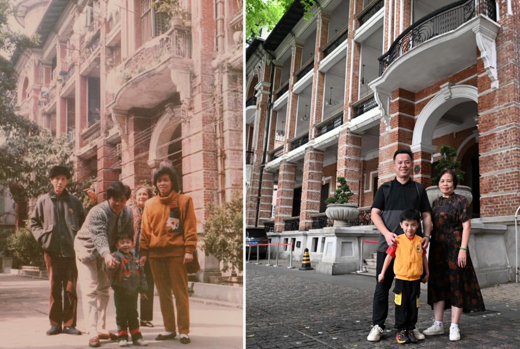 拼版照片:左图为广州市民杜煜杰(前中)与母亲(右一)等于1989年在广州沙面合影;右图为杜煜杰(后左)与母亲、儿子在广州沙面同一栋建筑前合影。