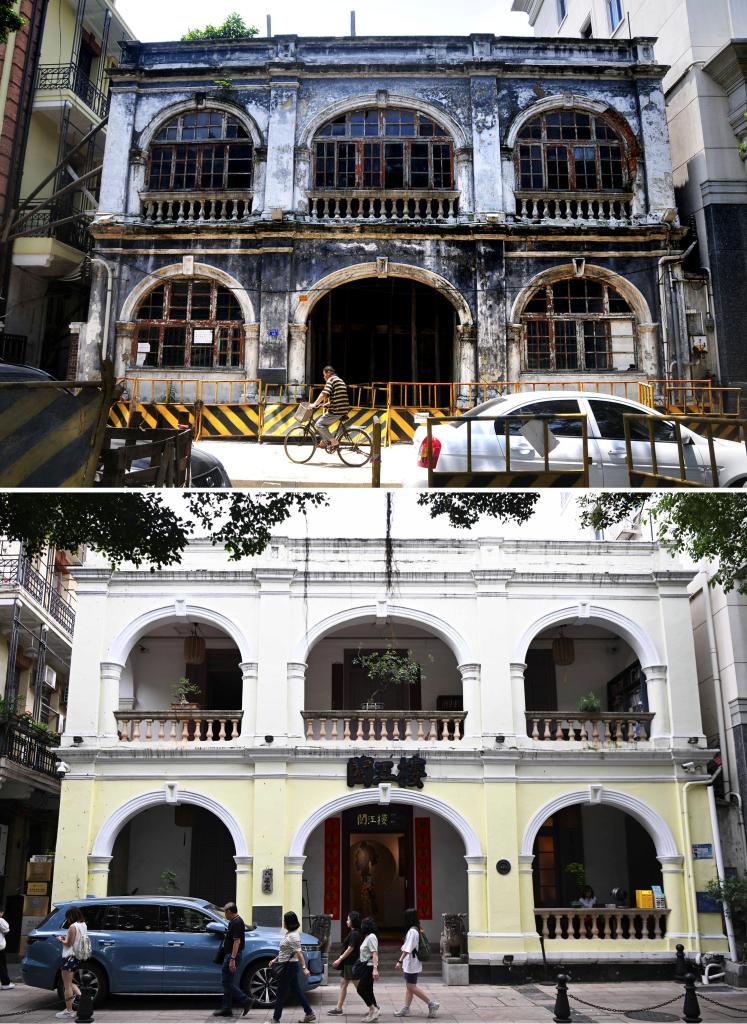 拼版照片:上图为2010年5月25日拍摄的广州沙面北街43号(资料照片)。下图为2024年4月17日拍摄的修缮后的广州沙面北街43号。
