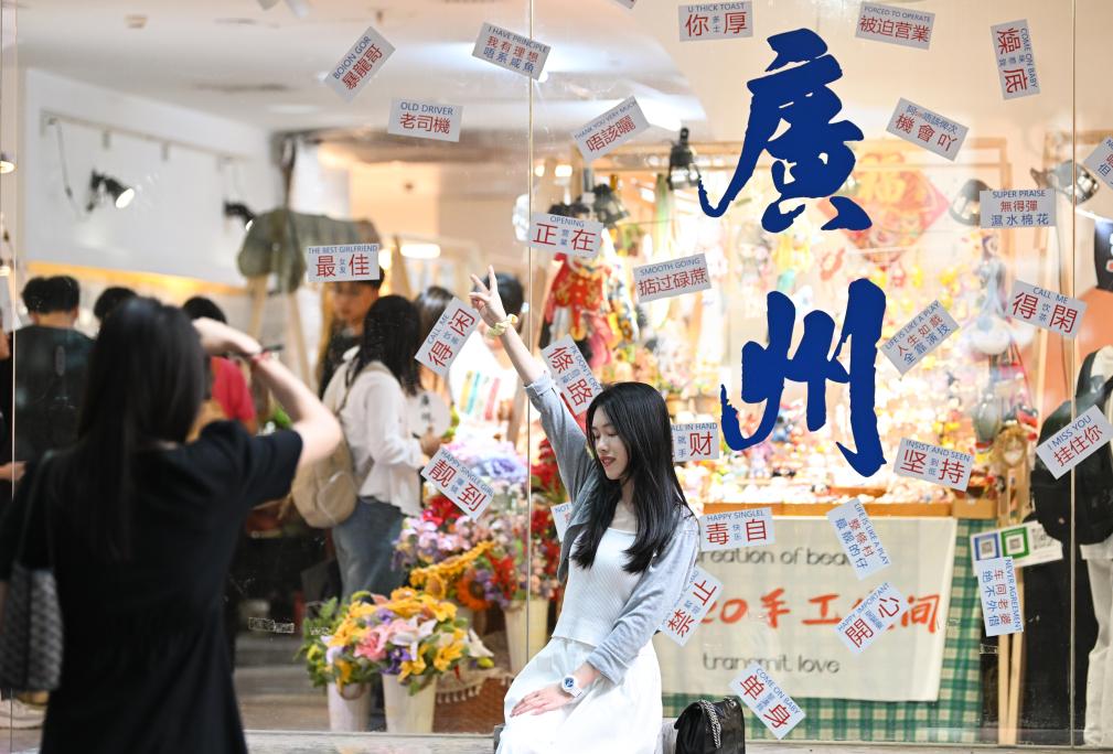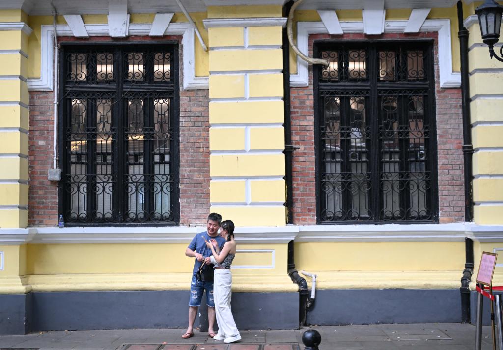 游客在广州沙面的店铺打卡拍照(4月13日摄)。