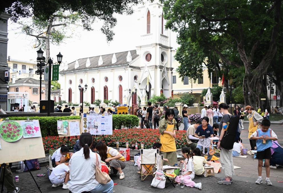 小朋友在广州沙面大街写生(4月13日摄)。
