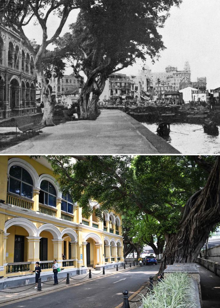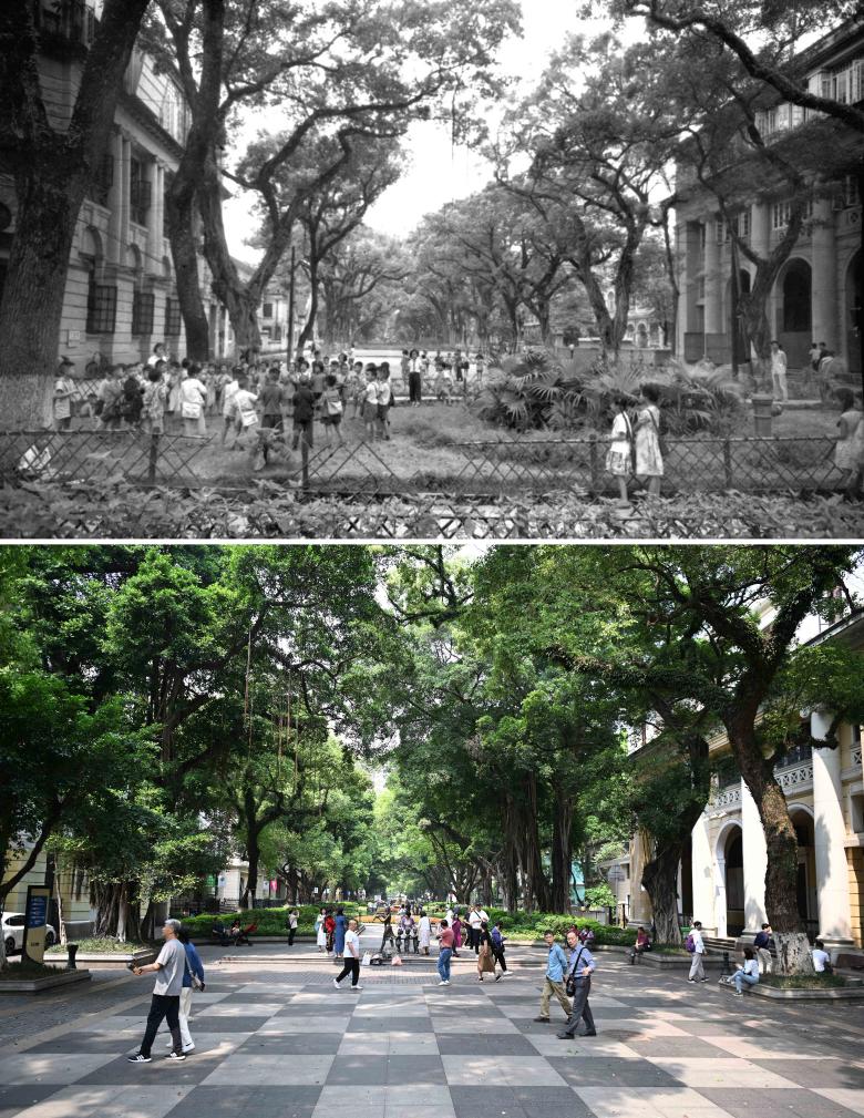 拼版照片:上图为广州沙面大街街景(资料照片);下图为2024年4月11日在同一位置拍摄的广州沙面大街。