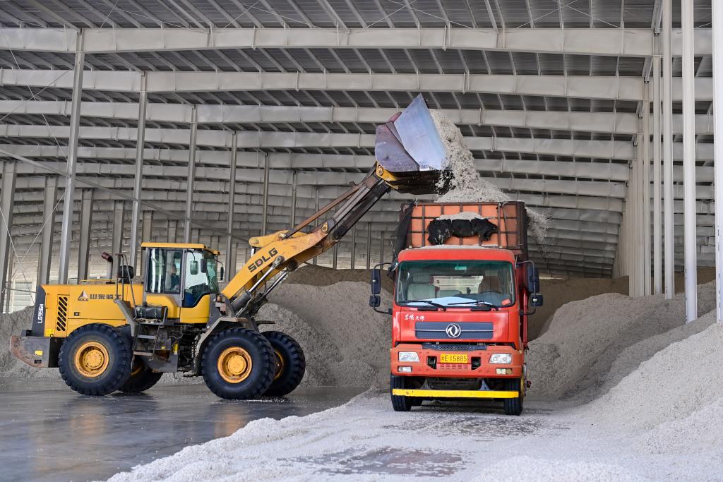 2024年4月12日,新疆生产建设兵团双河市的一家公司里,工作人员在装运棉籽。新华社记者 丁磊 摄
