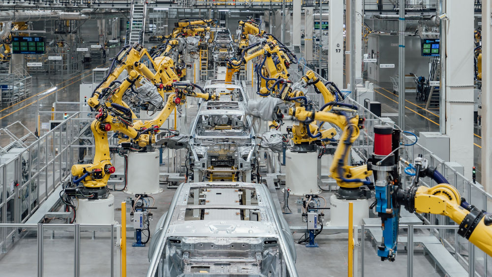 这是在重庆市两江新区拍摄的赛力斯汽车超级工厂焊装车间生产线(2024年2月26日摄,无人机照片)。新华社发(高彰 摄)