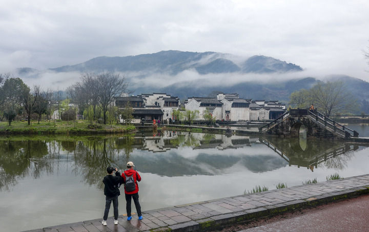 游客在安徽省黄山市徽州区呈坎古村欣赏雨后春景。新华社发(施亚磊 摄)