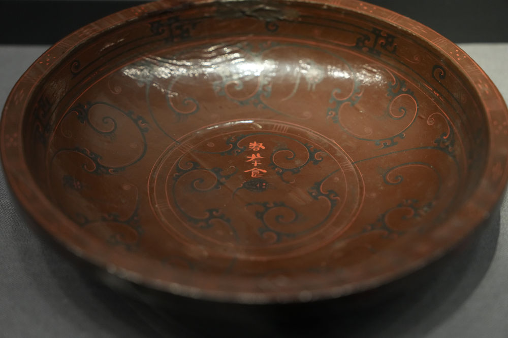这是2024年5月13日在湖南博物院长沙马王堆汉墓陈列展厅拍摄的“君幸食”狸猫纹漆食盘。新华社记者 薛宇舸 摄