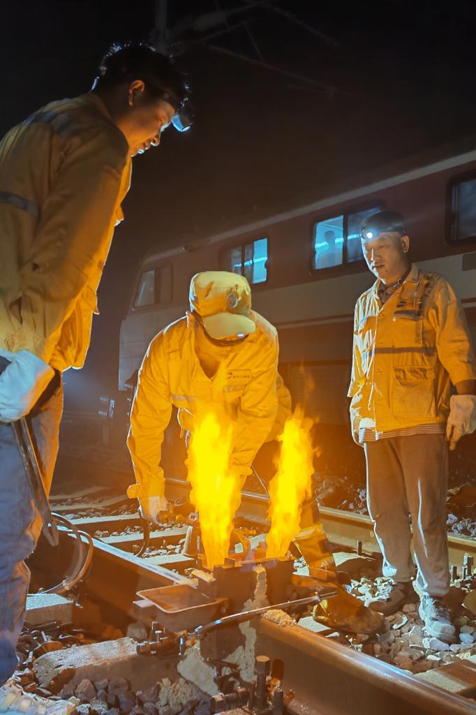 凌晨时分的宁启铁路海安站,万籁俱寂,凉风习习。在站台北面岔区,却是另一番热火朝天的忙碌景象:工人戴着的头灯、运输钢轨的机车车灯和置于钢轨间的泛光灯,将这一小片区域照亮,切割、打磨钢轨的火花四溅,在夜色中尤为绚烂,熔化钢砂的火焰和铝热焊接产生的氧化铝块,向四周散发着炙热,工人们“一二三”的号子不时响起。