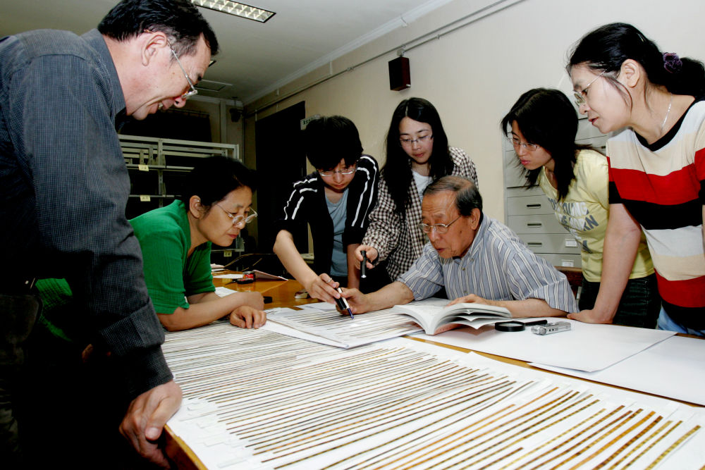 李学勤先生(右三)与清华大学的师生们正研讨清华简(2009年夏拍摄)。清华大学出土文献研究与保护中心供图